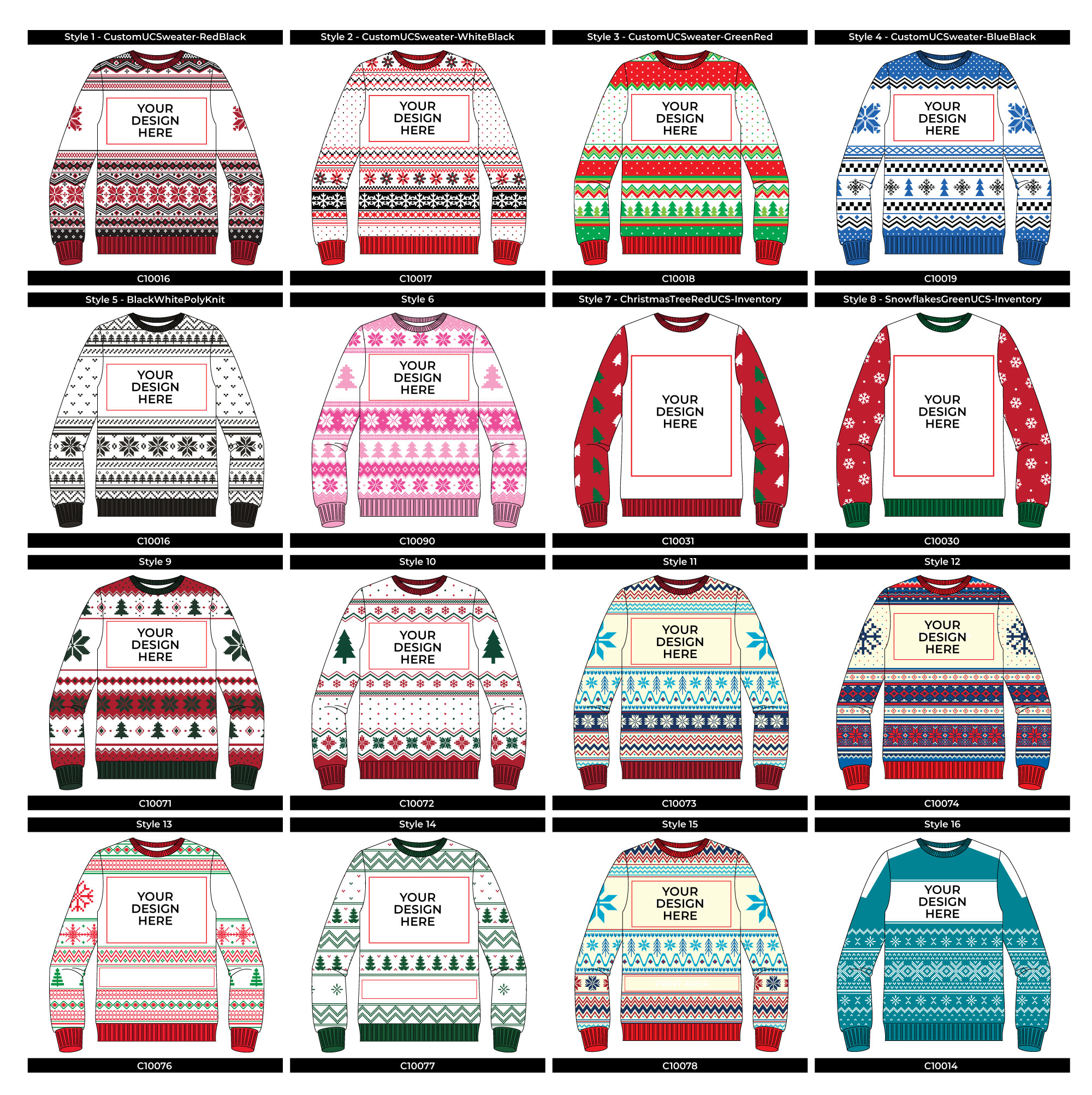 Customize our knitted holiday sweaters with your logo or design. Select from 16 pre-approved patterns, each featuring a blank panel for your branding.
